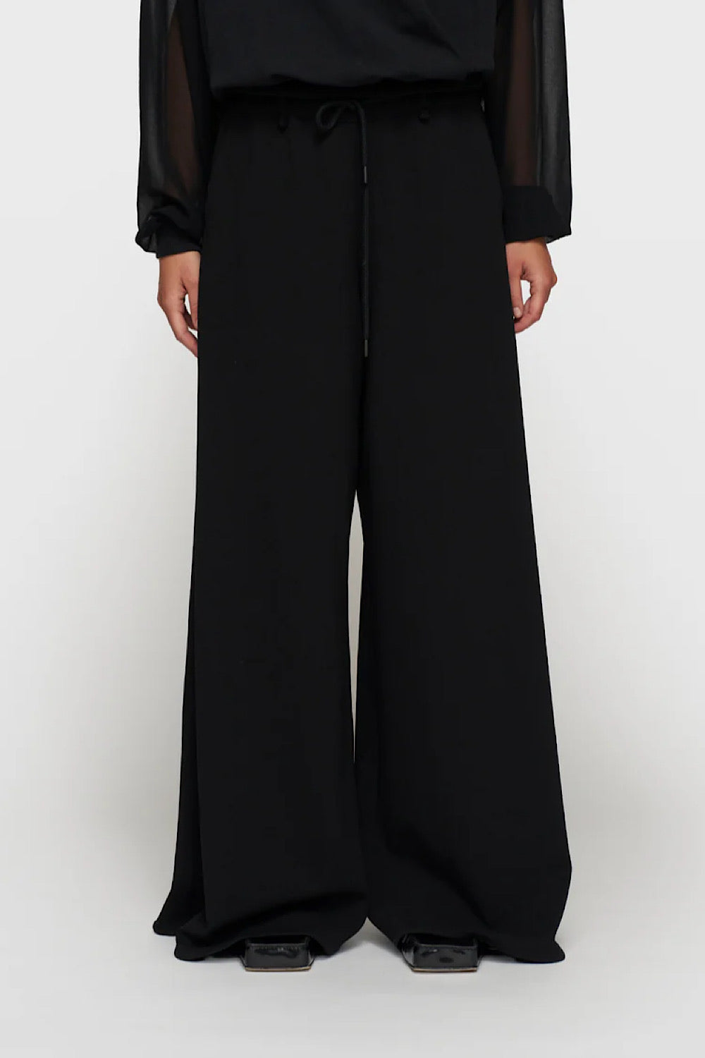 Pantalón ancho en negro con caída fluida y cintura ajustable mediante cordón.