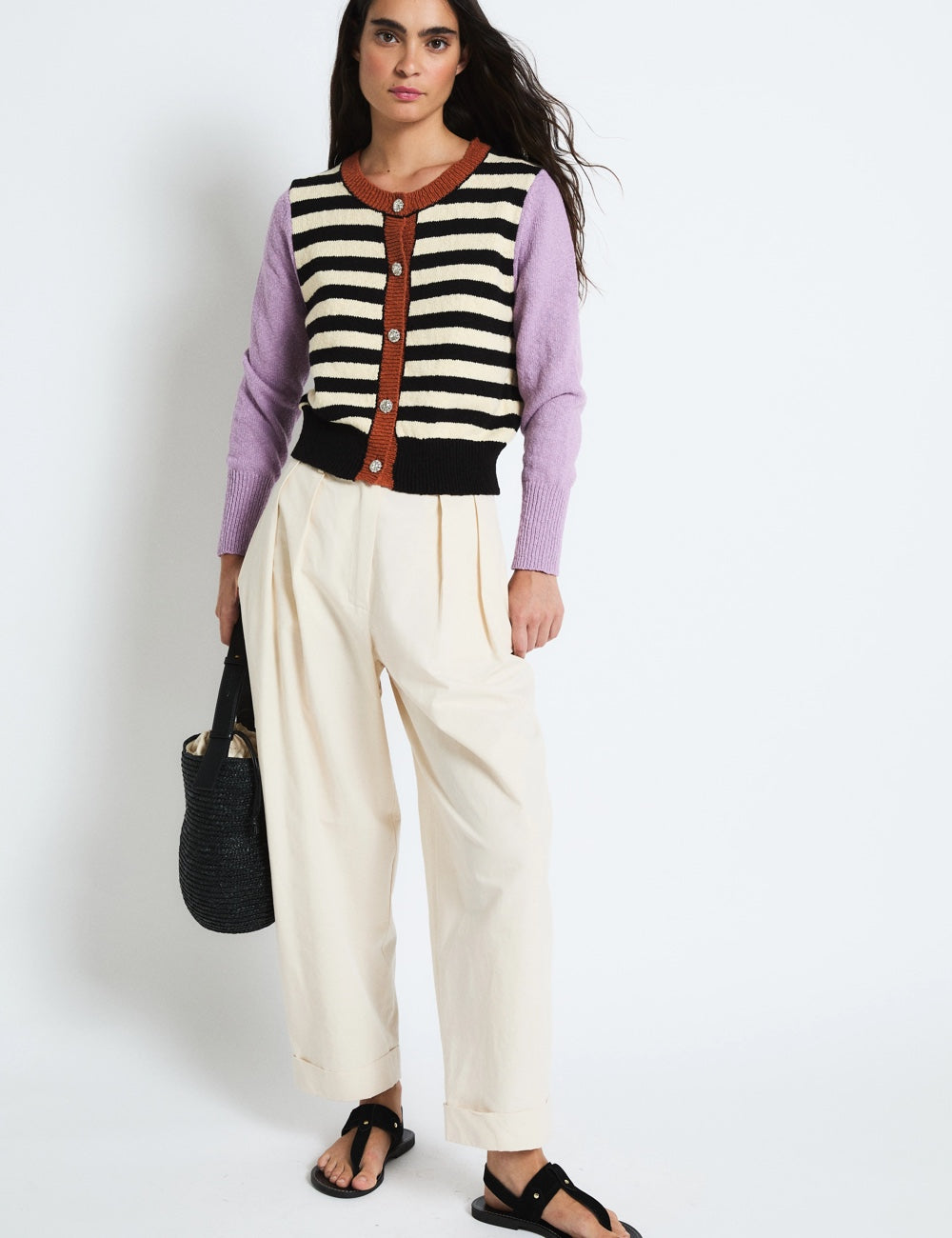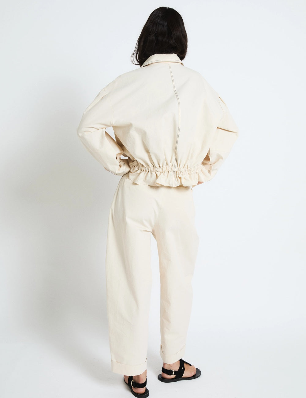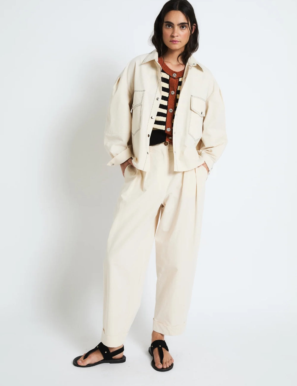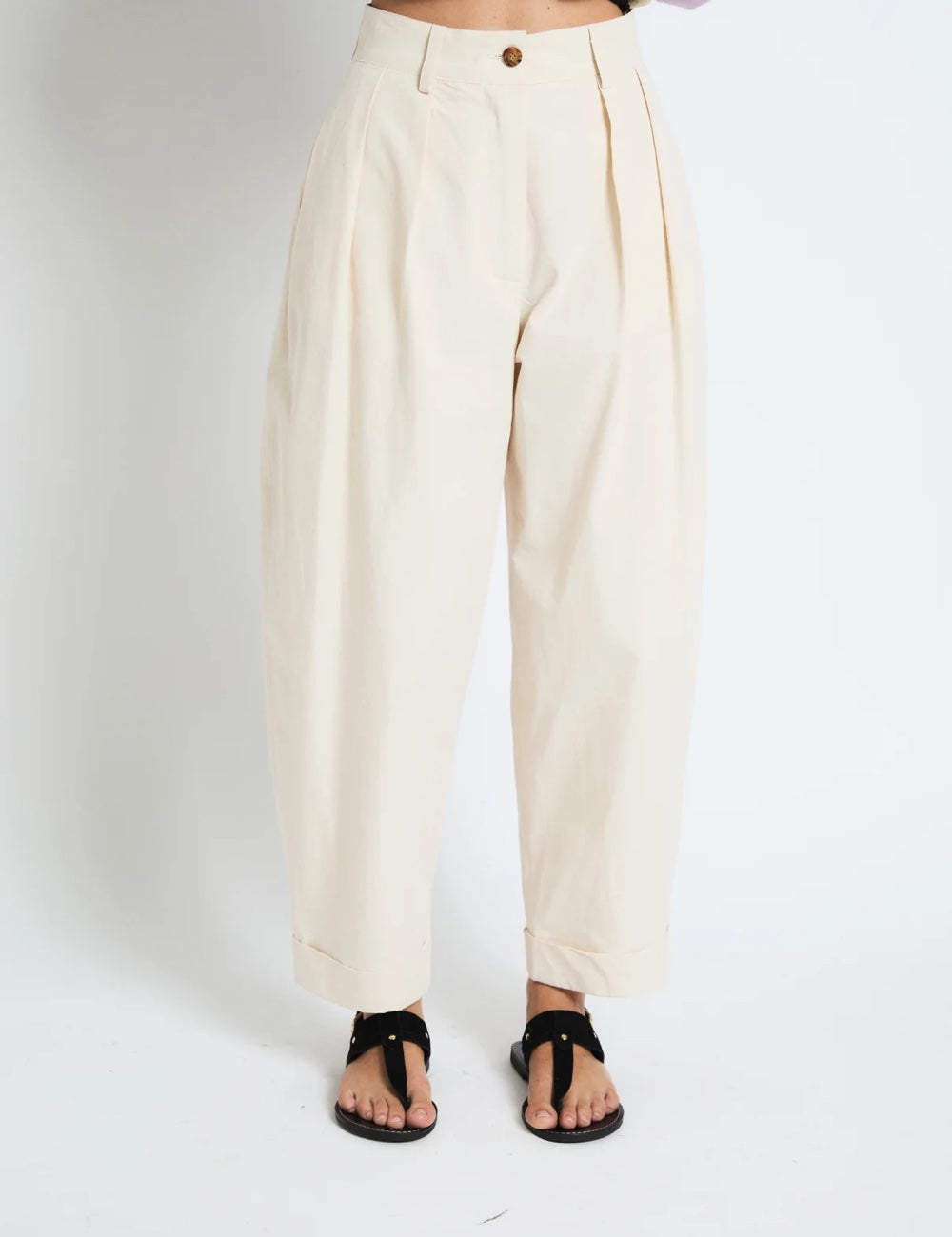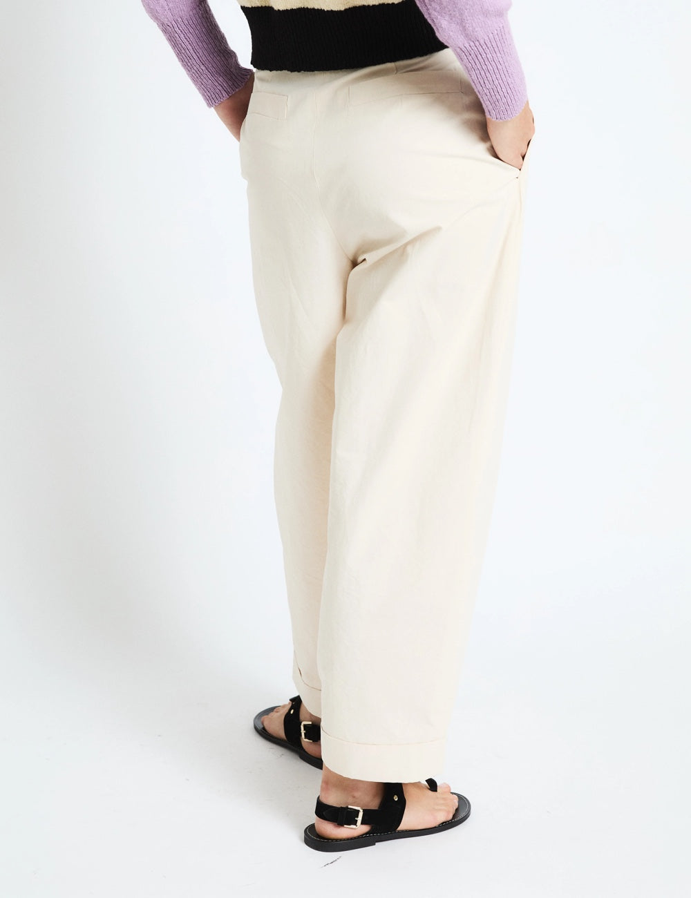 Pantalón de corte amplio en color crudo, con pinzas frontales que aportan volumen y un estilo relajado. Tiene cintura alta, cierre con botón y el bajo vuelto. Una prenda con mucho estilo como las que nos gustan siempre de Sophie and Lucie.