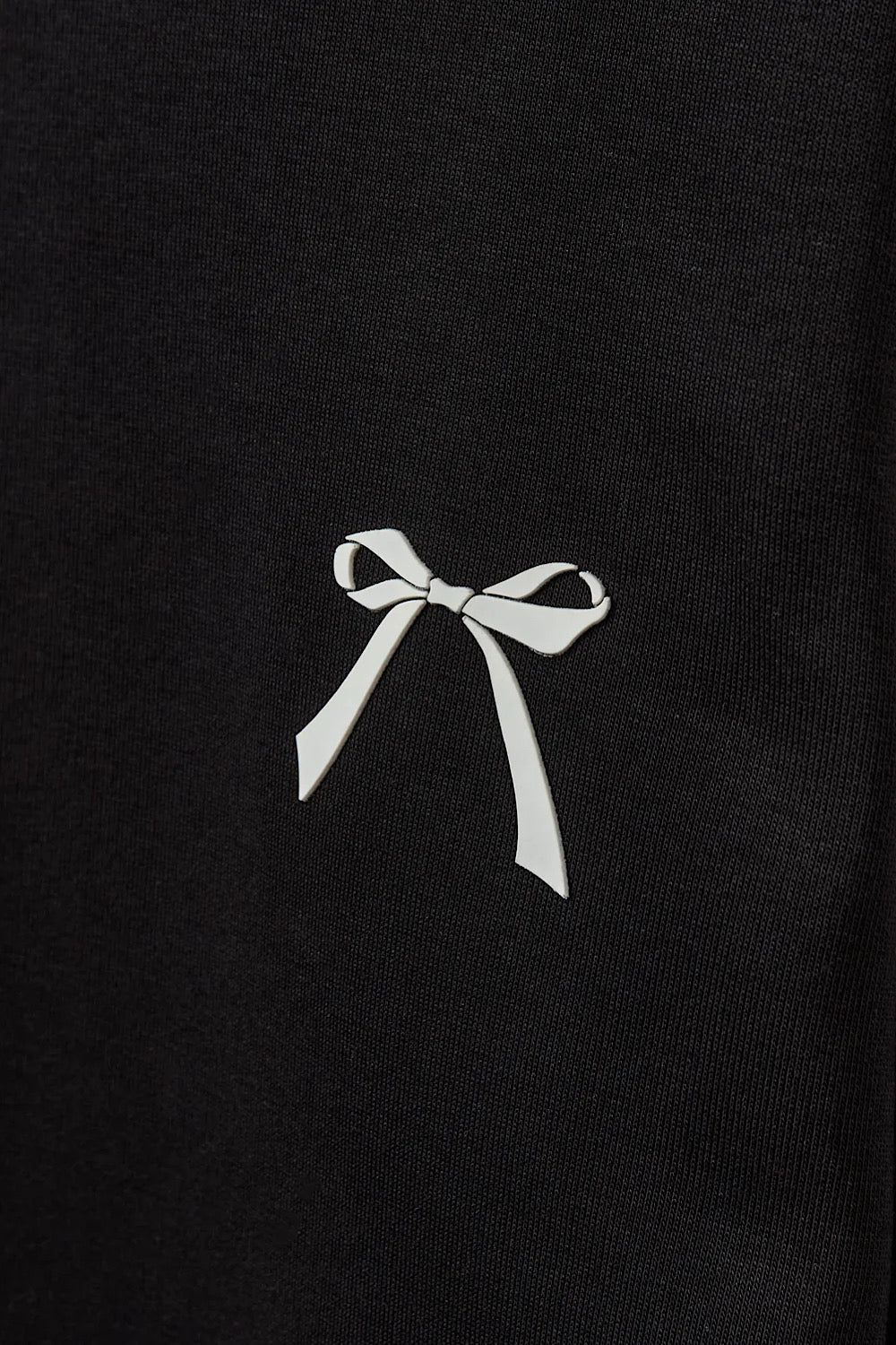 Sudadera de algodón en negro y detalle de pequeño lazo en el pecho a contraste en blanco y con relieve. También lleva detalle en la espalda. Nos encanta para combinar con tus vaqueros o faldas favoritos.