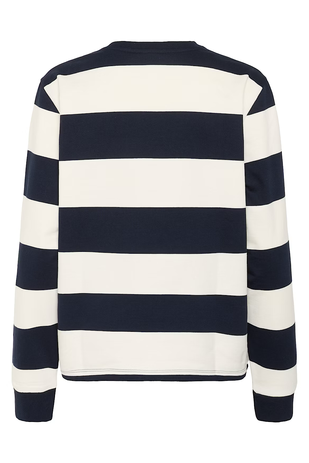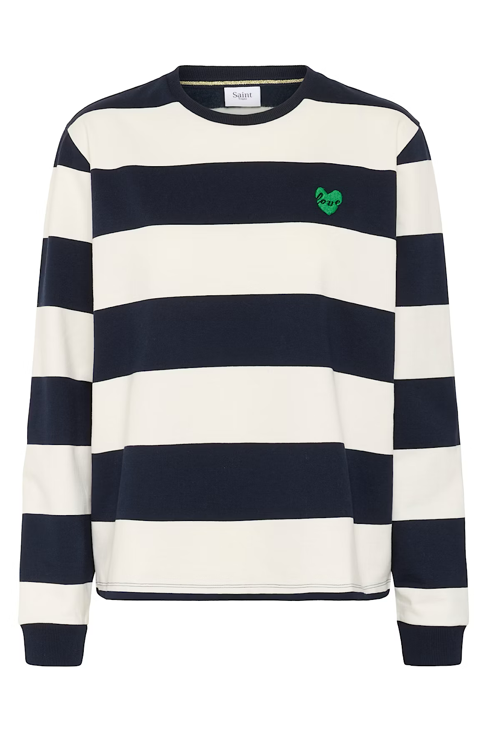 Sudadera a rayas de cuello redondo para mujer con corte holgado, mangas largas y un sutil bordado de corazón. Cómoda y versátil para ocasiones informales, esta prenda presenta una silueta recta y puños acanalados.