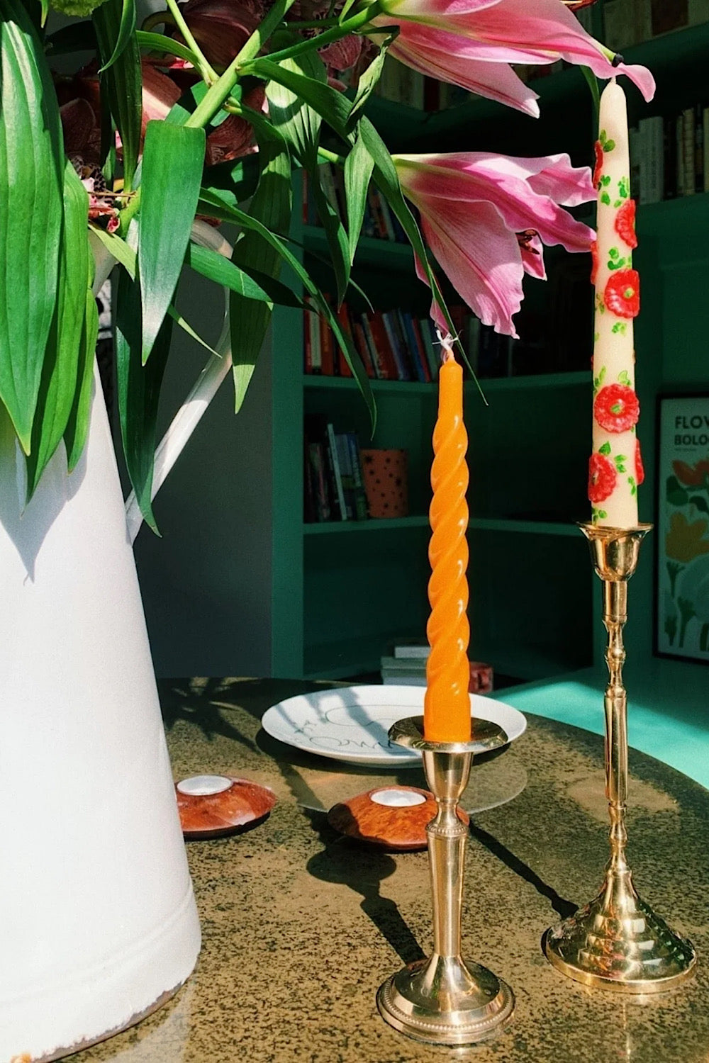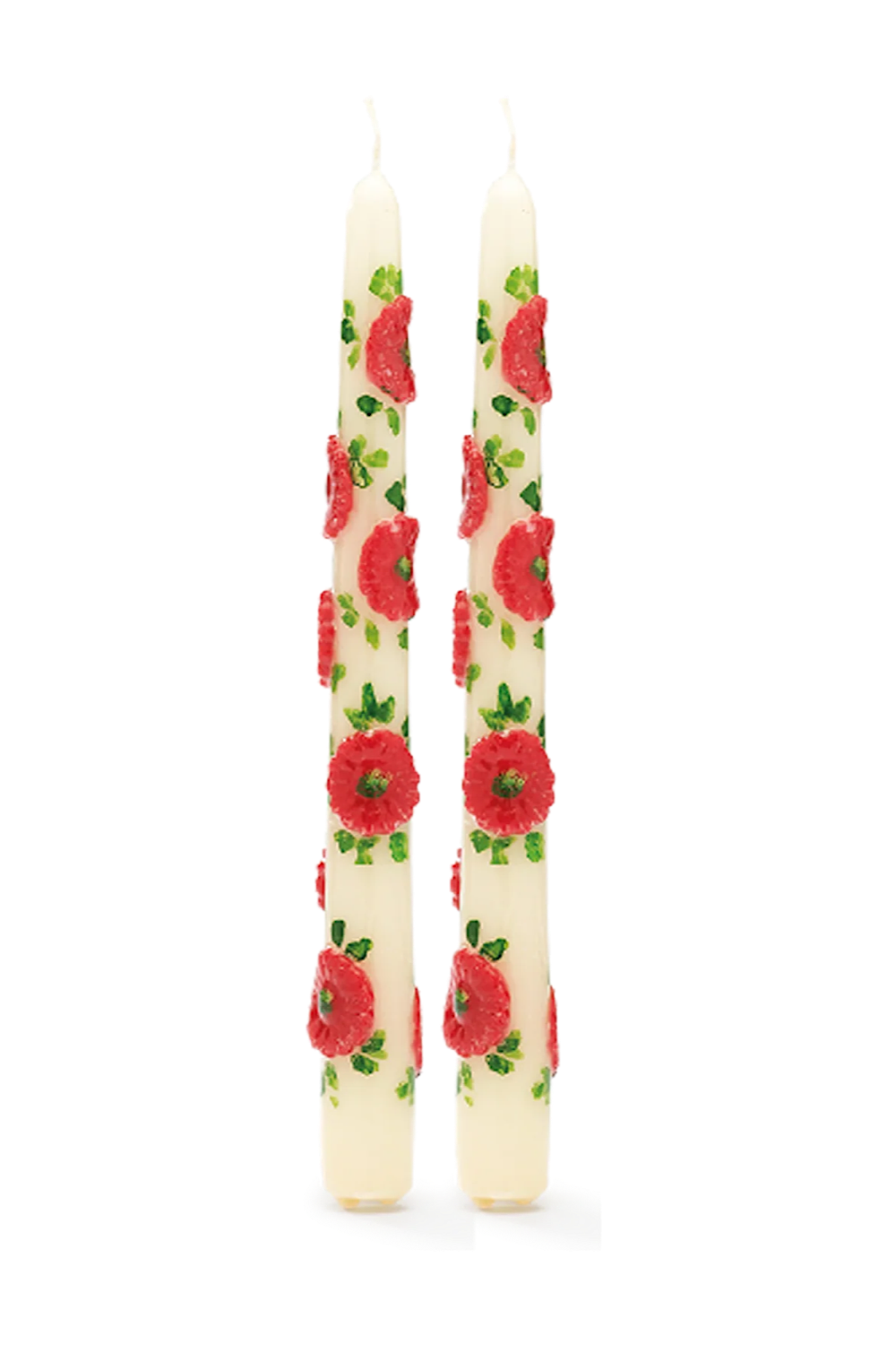 Set de 2 velas muy original y divertido, con el que vestirás tu mesa de manera muy especial. Detalle de flores rojas en 3D.