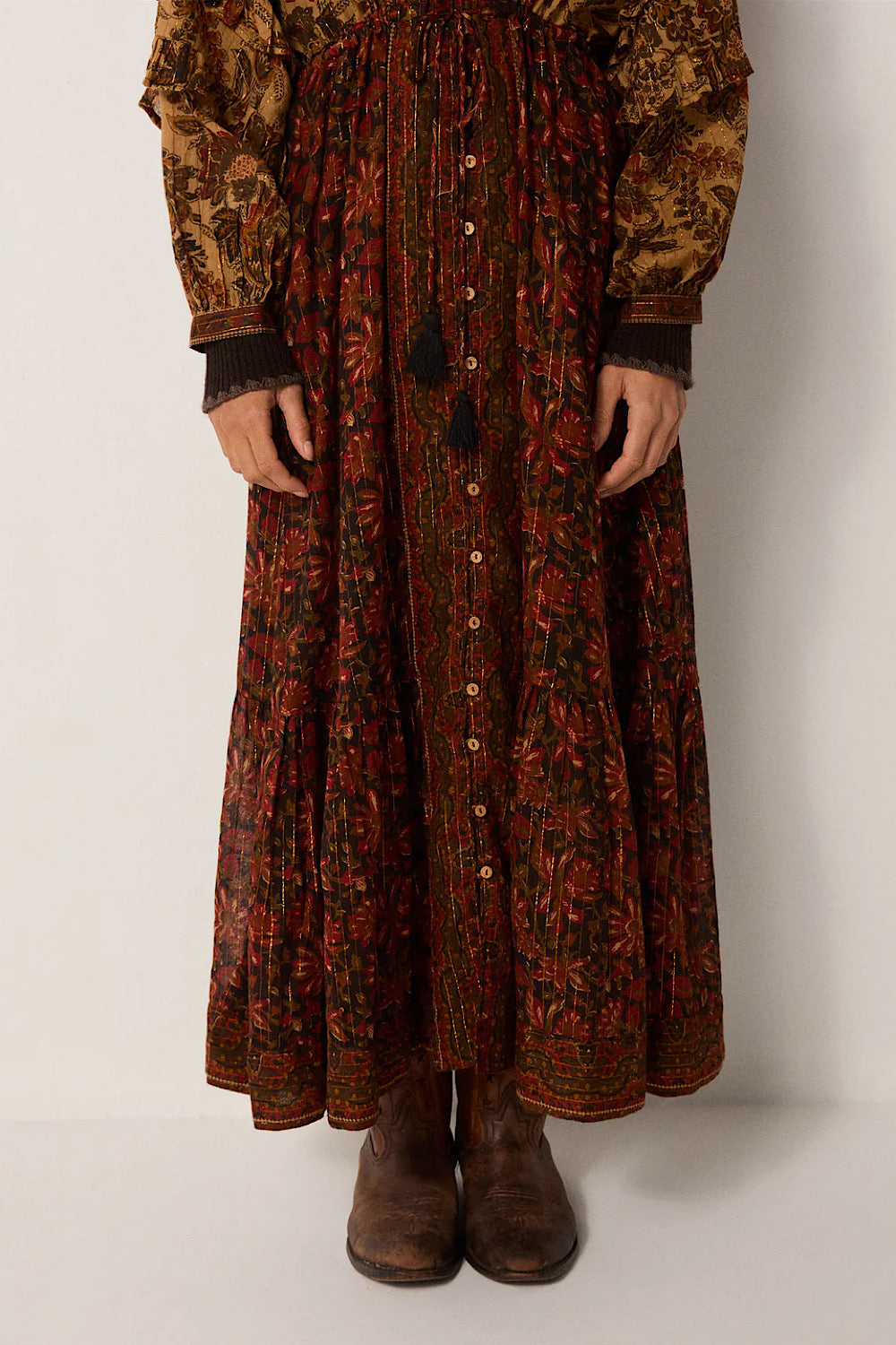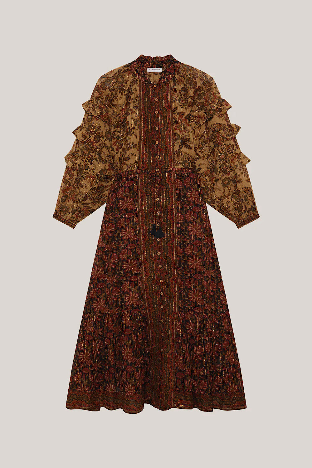 Vestido con detalle de lurex en el tejido, botones tipo camisero y ajustable a la cintura. Nos encantan las maxi mangas con detalle de mini volantes. Una prenda muy especial y versátil para tu día a día.