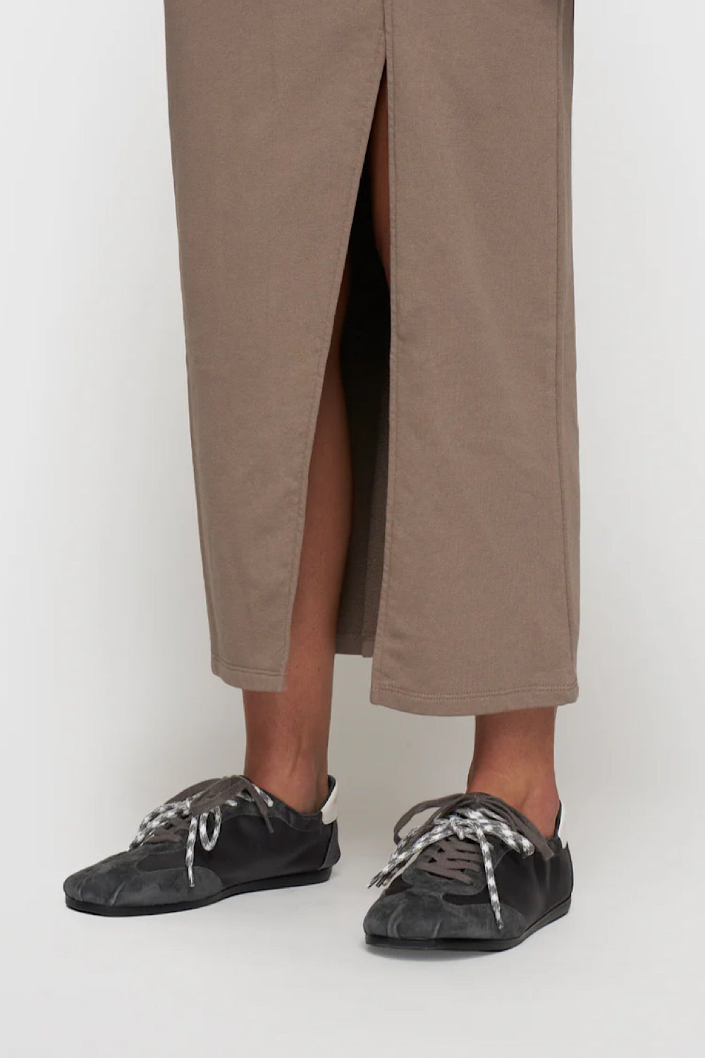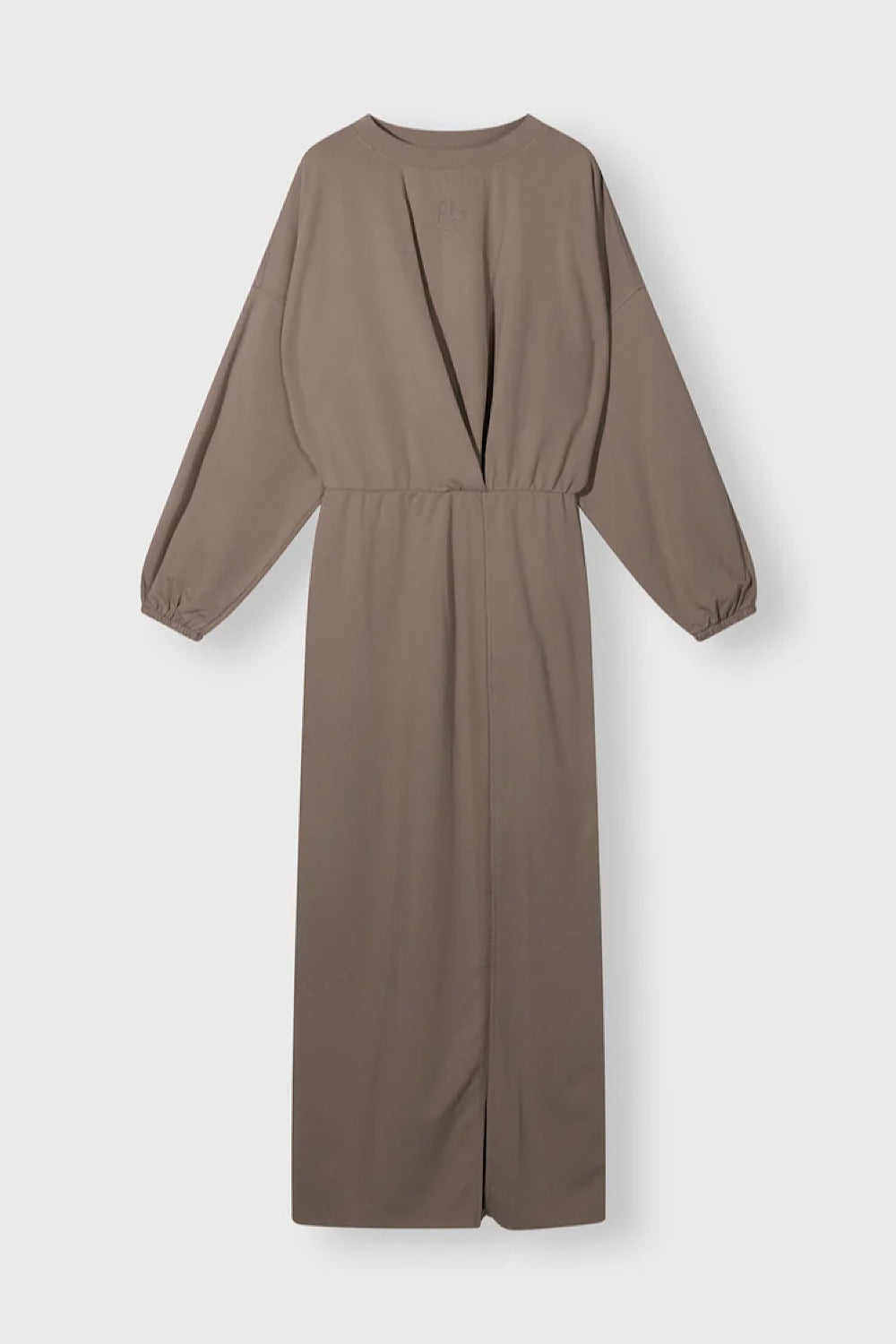 Vestido midi en tono topo con manga abullonada y abertura trasera.
