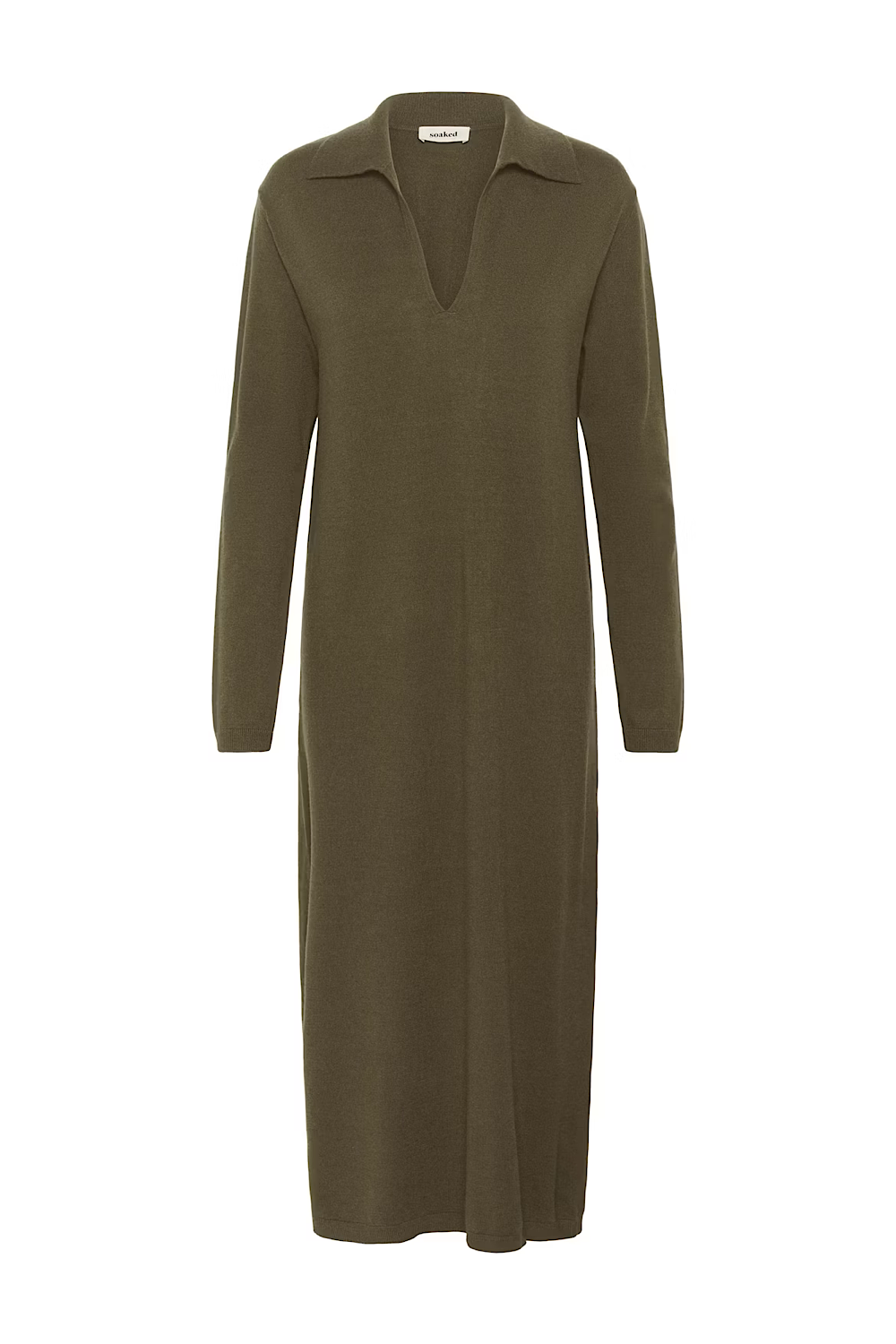Uno de esos vestidos que te pondrás sin parar esta temporada, vestido de punto con cuello tipo polo en un tono verde kaki súper combinable.