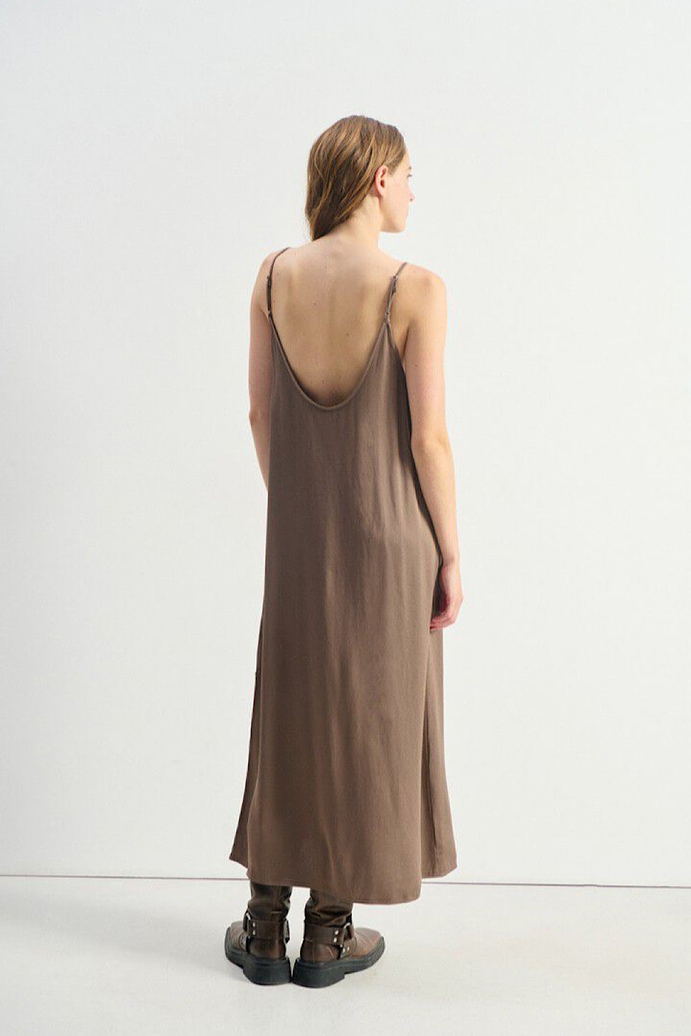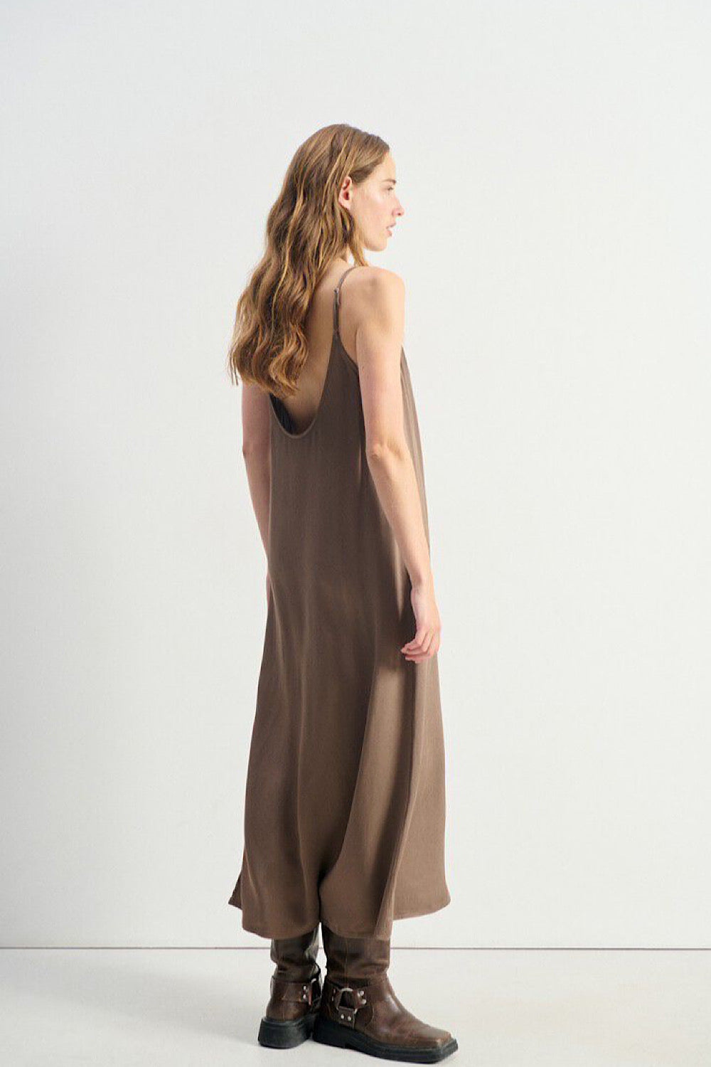 Vestido largo de tirantes finos en tono topo, tipo lencero, con escote redondeado y caída fluida. Su diseño minimalista realza la silueta con elegancia discreta. Perfecto para llevar con sandalias en verano o con botas y punto en los meses más fríos, creando un look sofisticado y versátil durante todo el año. Para no pasar frío combínalo con un jersey oversize encima, nos encanta con el modelo Mouline en tono mantequilla.