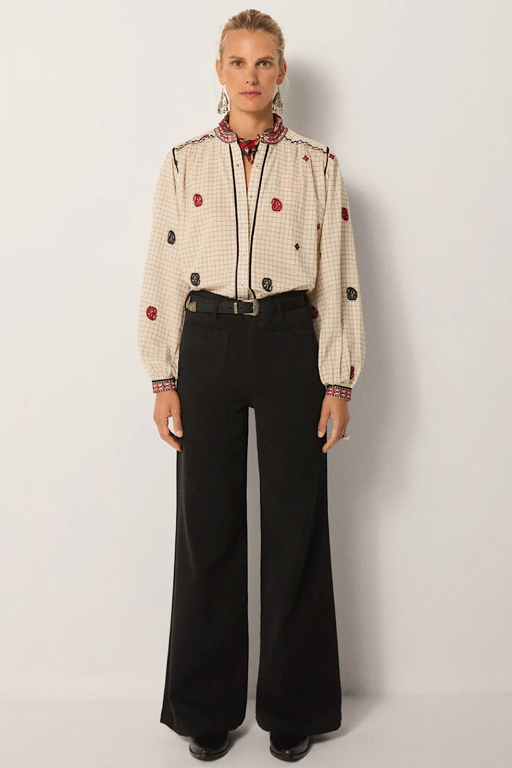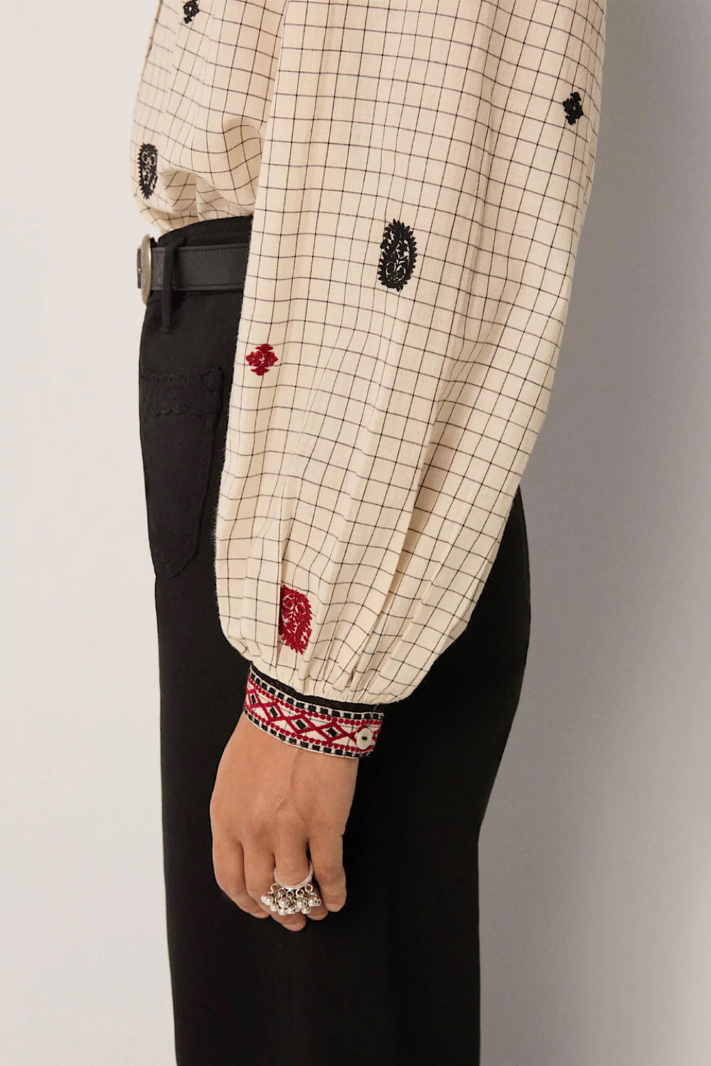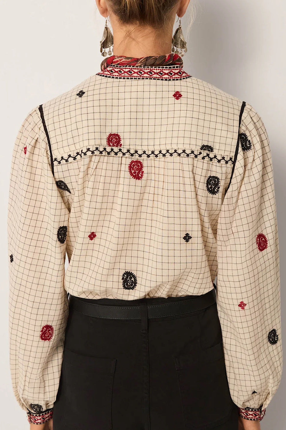 Una blusa ideal, estampado de cuadros con detalle de bordados en rojo y negro, una mezcla que la hacen muy especial.