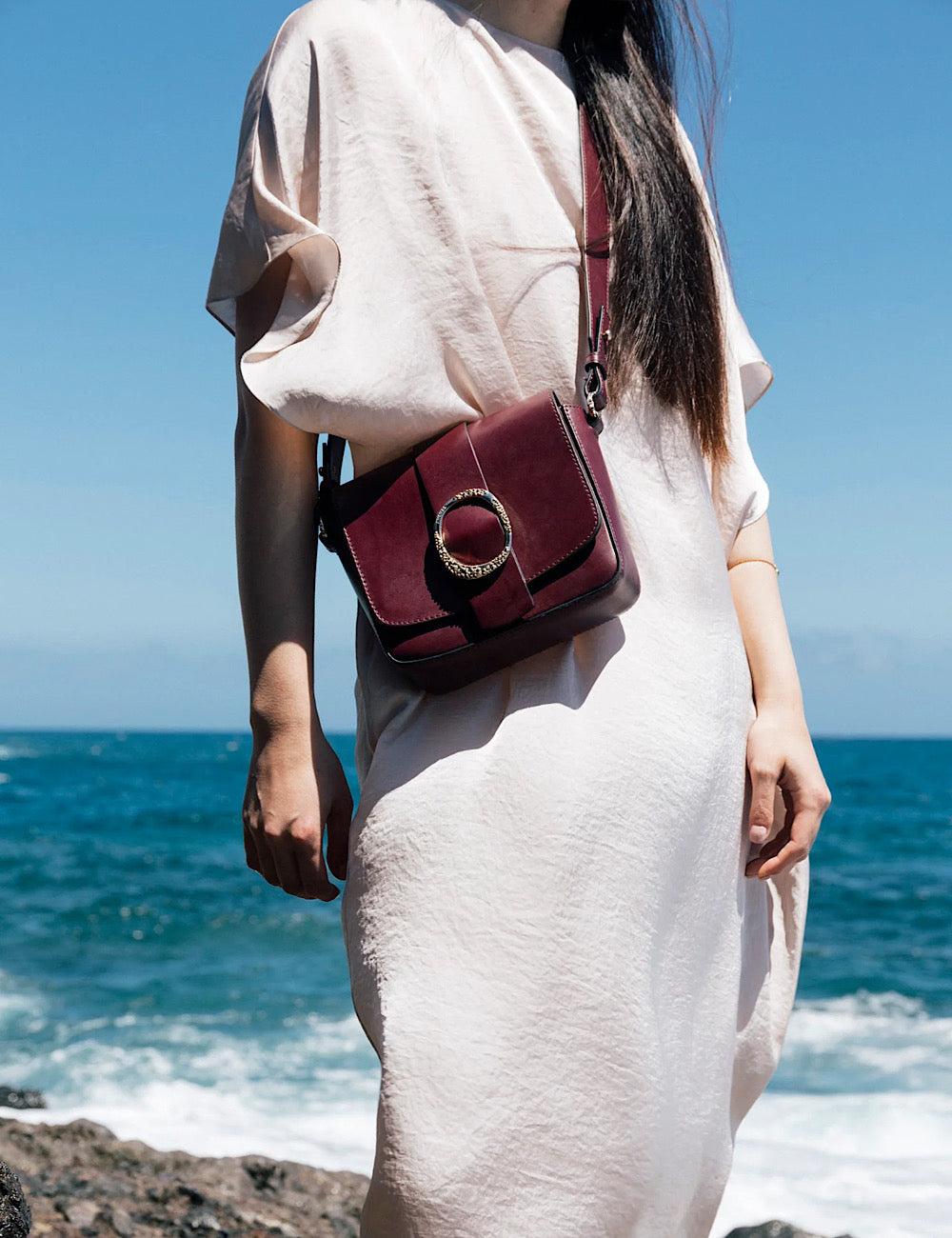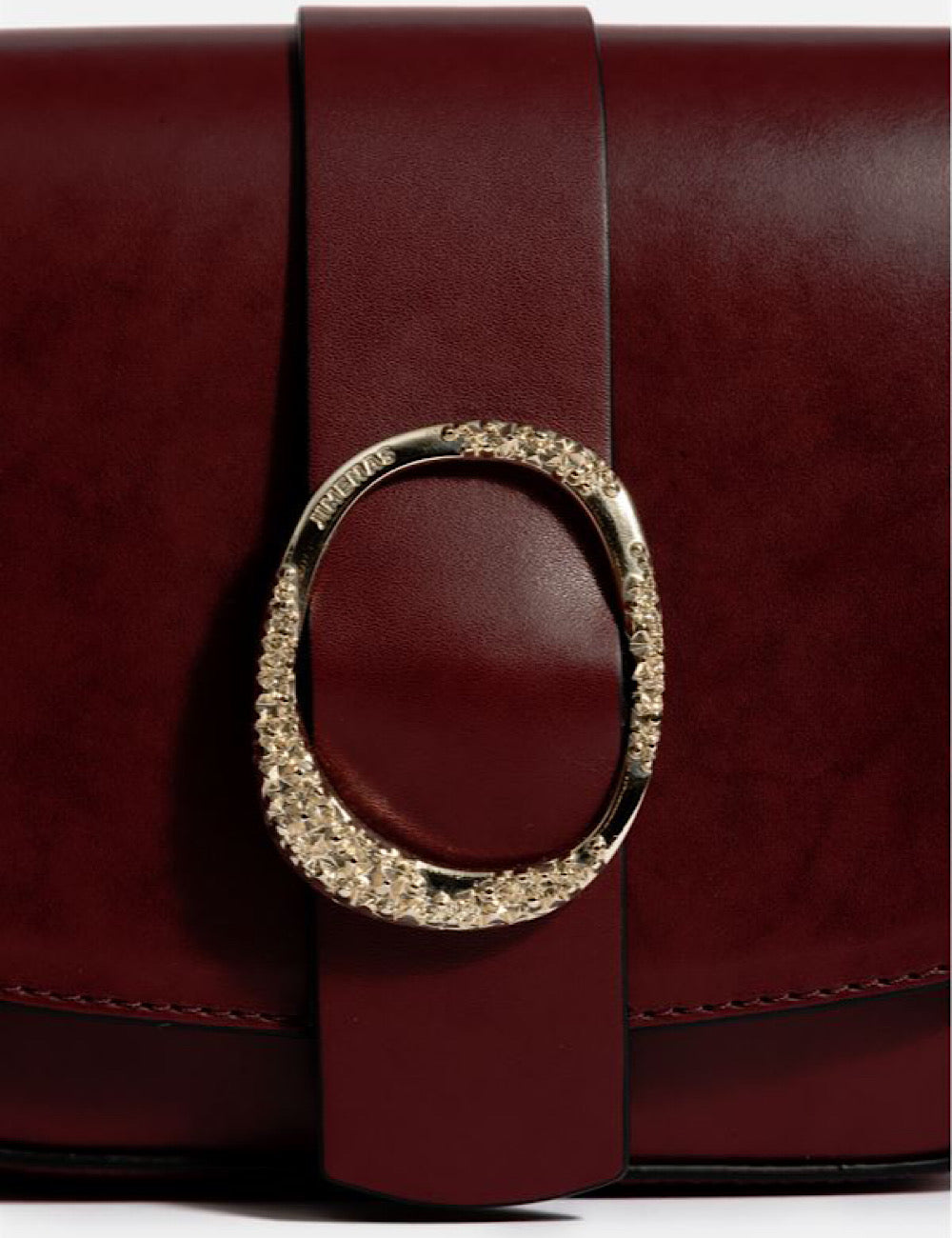 Bandolera realizada en piel vacuno de alta calidad en piel premium color vino con aguas. Cierre oculto de imán de máxima fuerza en vista interior. Forro interno en mezcla de algodón. Bolsillo interior de piel. Logo grabado con tinta blanca en la vista interior. Cantos a contraste tintados en negro con pincel a mano. Hebillas diseño exclusivo de JIMENAS en acabado oro tenue.