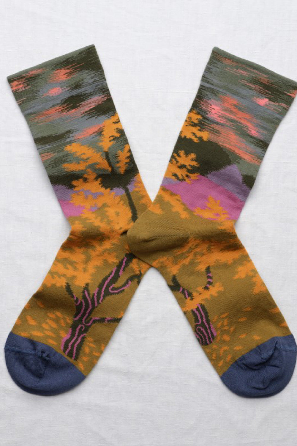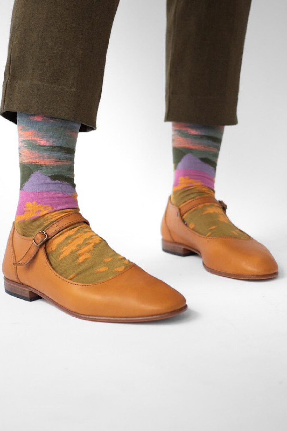 Estos calcetines presentan un diseño delicadamente abstracto, inspirado en paisajes invernales. Los tonos suaves y fríos evocan la calma de la temporada, aportando una sensación de serenidad y frescura a tu atuendo.