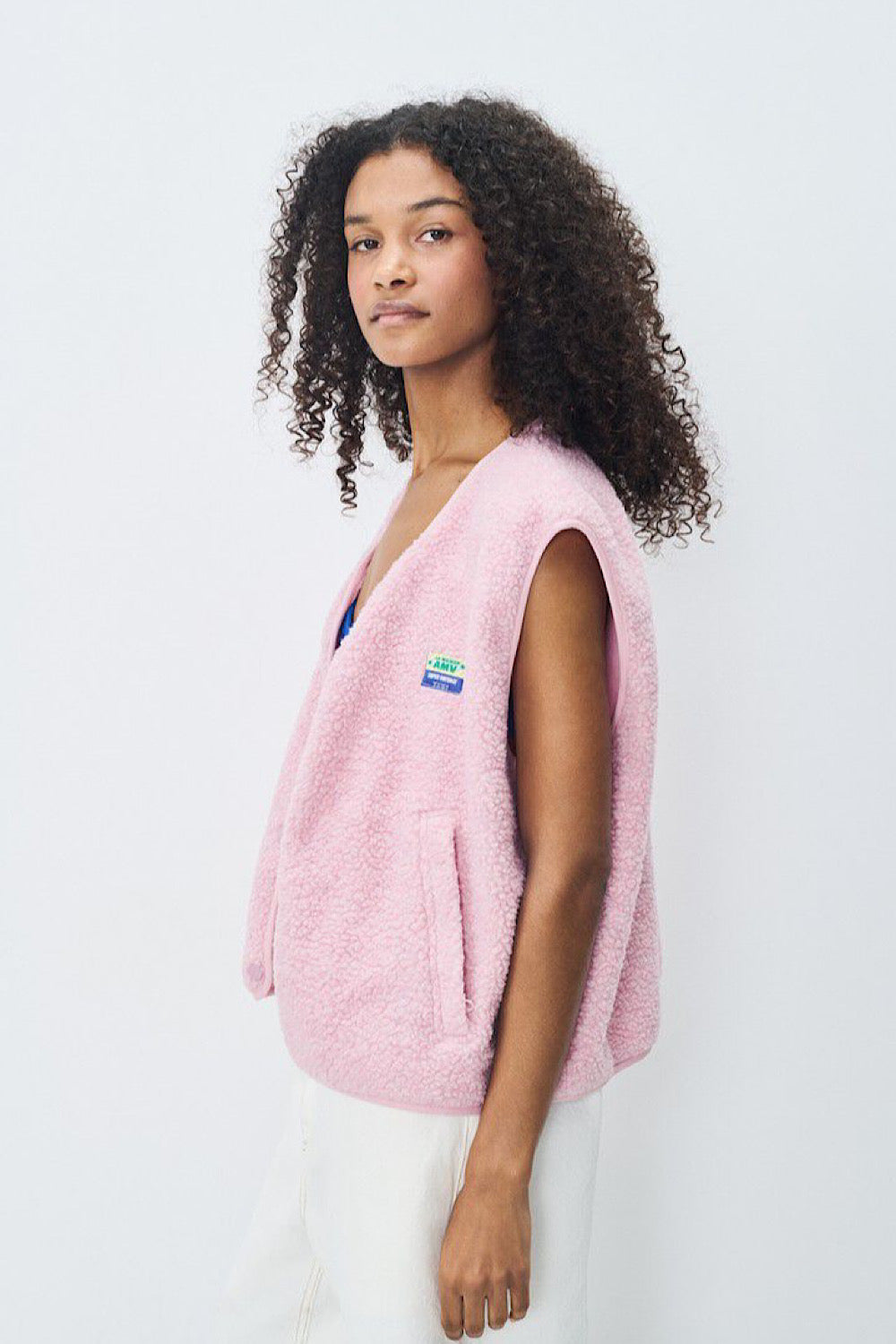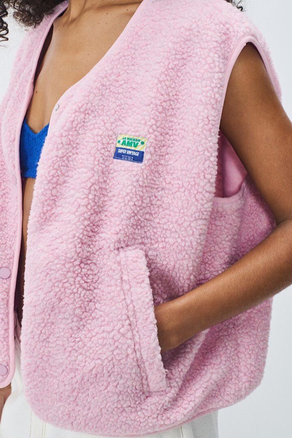 Chaleco de borreguito en tono rosa pastel con textura suave y volumen ligero. Diseño de corte recto con escote en pico, cierre de botones a presión y bolsillos laterales. Detalle de etiqueta bordada en el pecho con aire retro. Perfecto para combinar sobre camisas, camisetas o jerséis finos y aportar un toque desenfadado y cálido a tus looks.