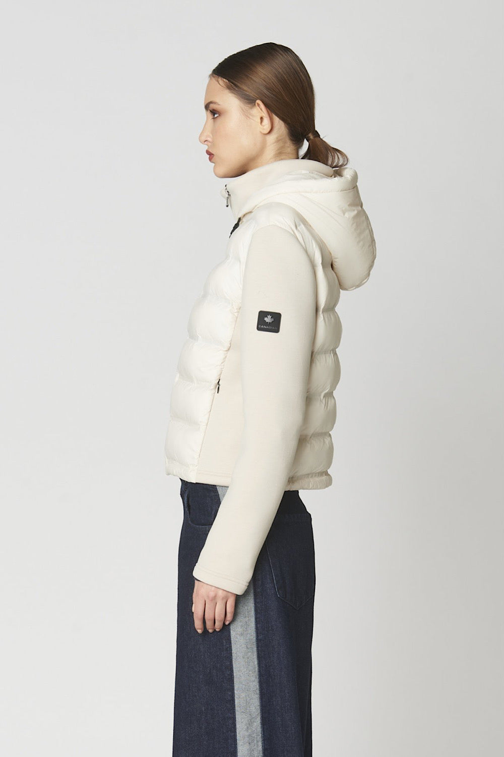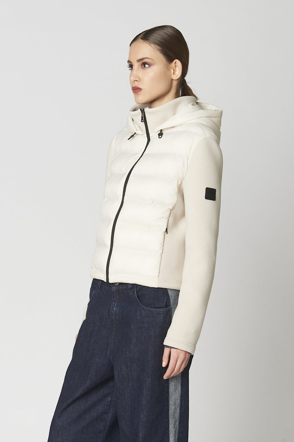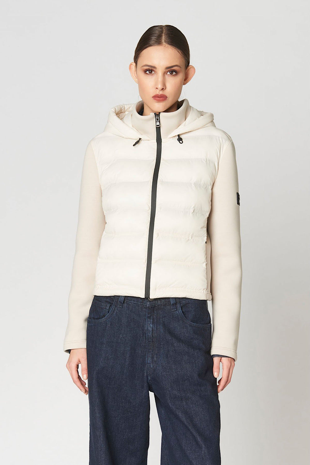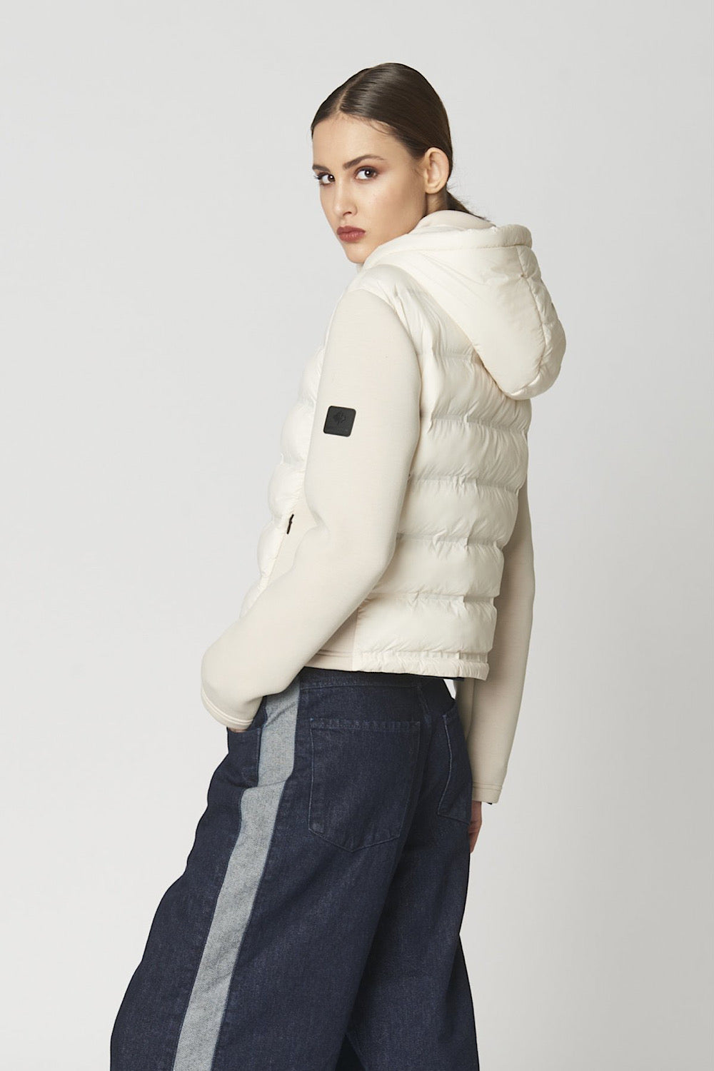 Chaqueta tipo plumífero corta, perfecta para looks más deportivos, con capucha y mangas en tejido de neopreno. Ir cómoda y con estilo nunca ha sido tan fácil. Nos encanta su color claro, para dar luz a los fríos días de invierno.
