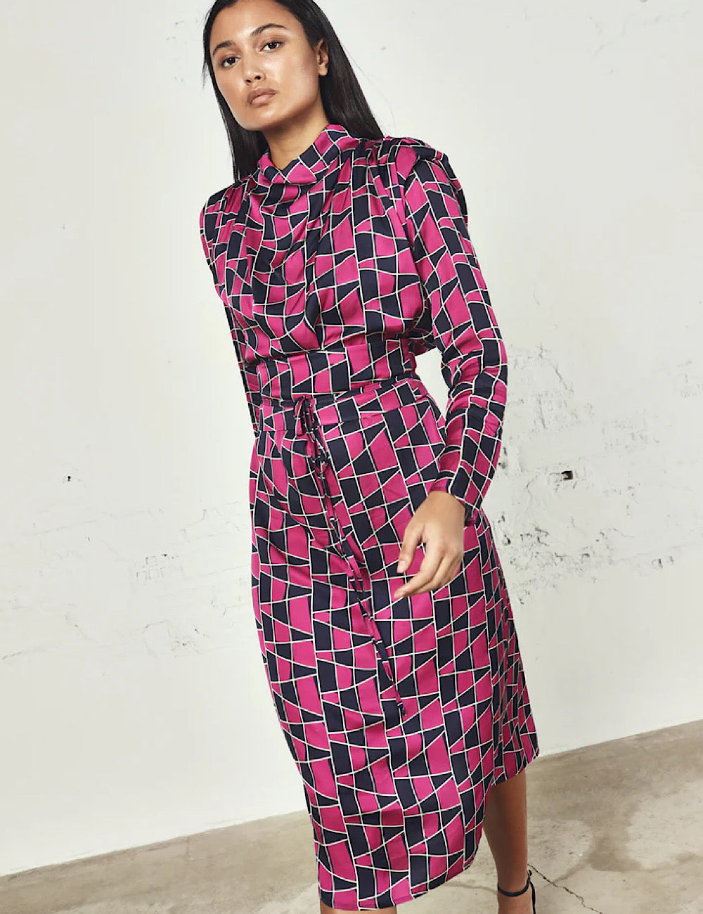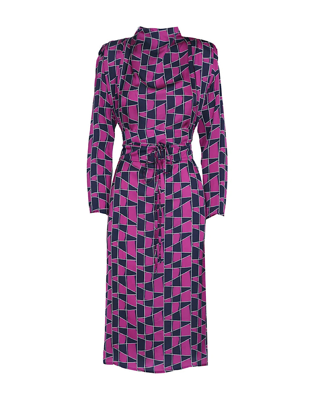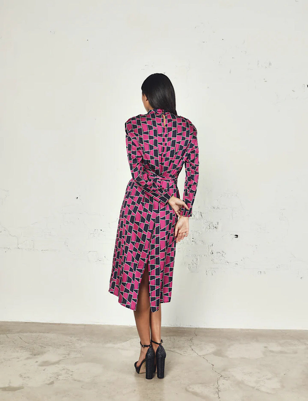 Un vestido ideal para tus eventos invernales, con hombreras en tejido estampado y cuello perkins. Una prenda con estilo y cómoda. Detalle de fajín para ajustar a la cintura en el mismo tejido, que le da un toque muy chic.