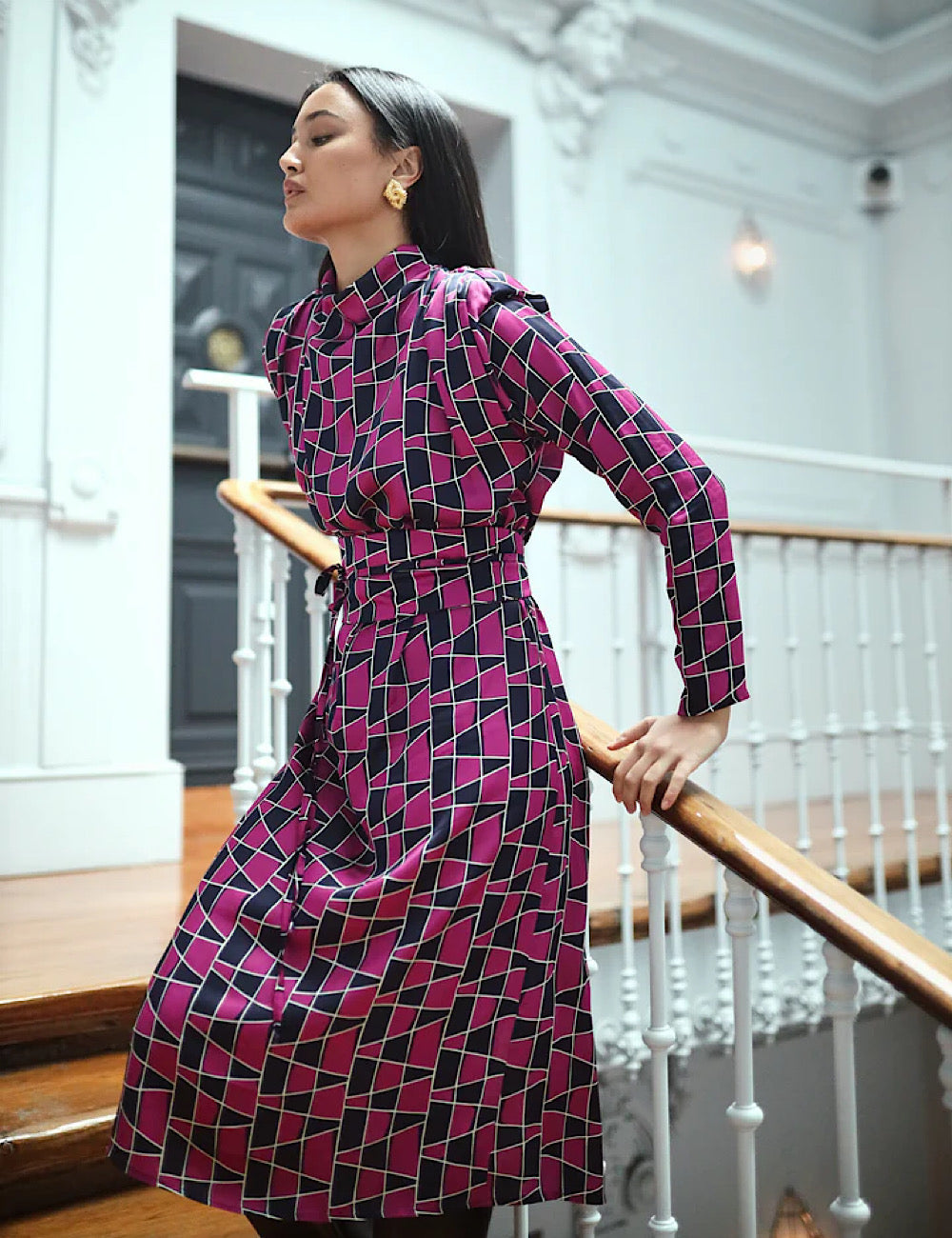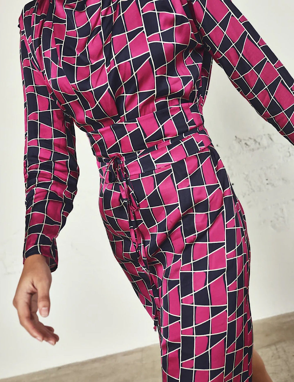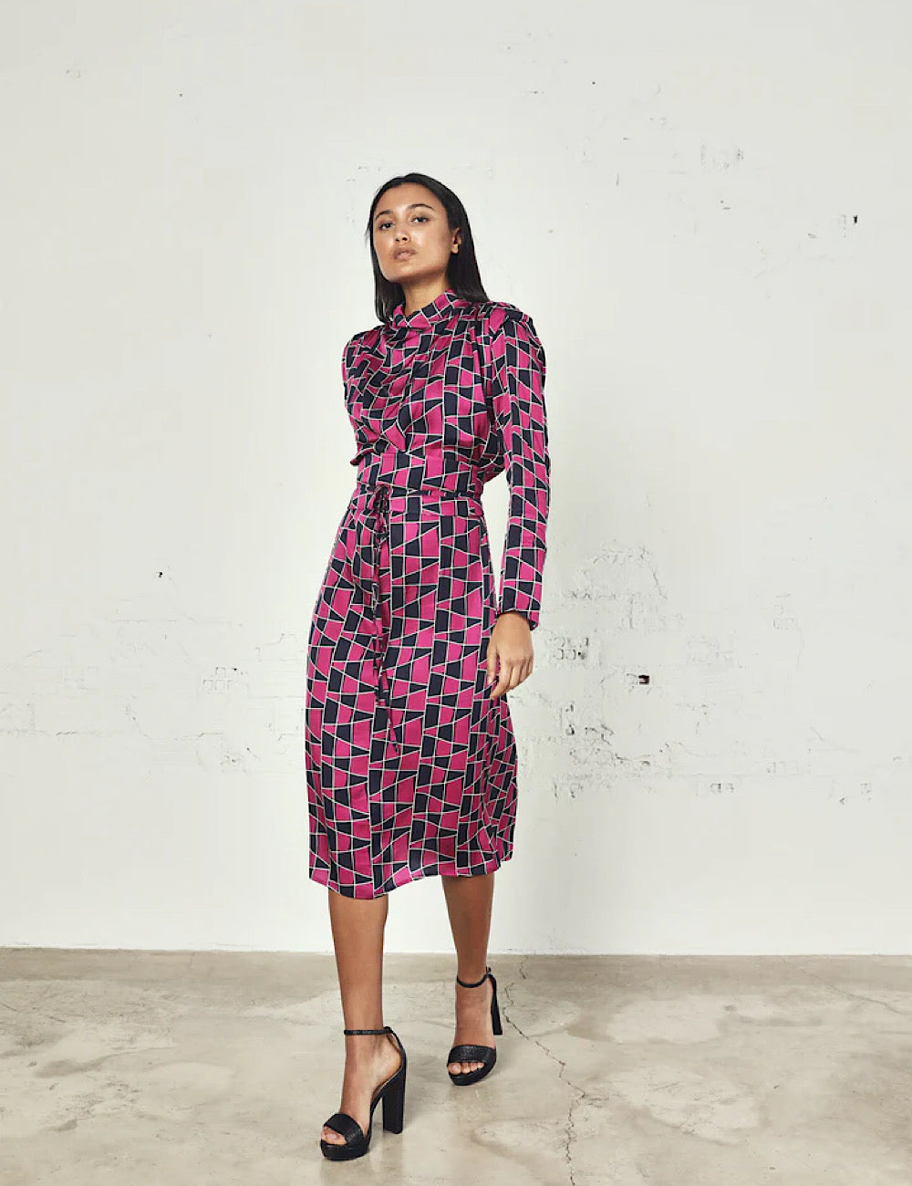 Un vestido ideal para tus eventos invernales, con hombreras en tejido estampado y cuello perkins. Una prenda con estilo y cómoda. Detalle de fajín para ajustar a la cintura en el mismo tejido, que le da un toque muy chic.